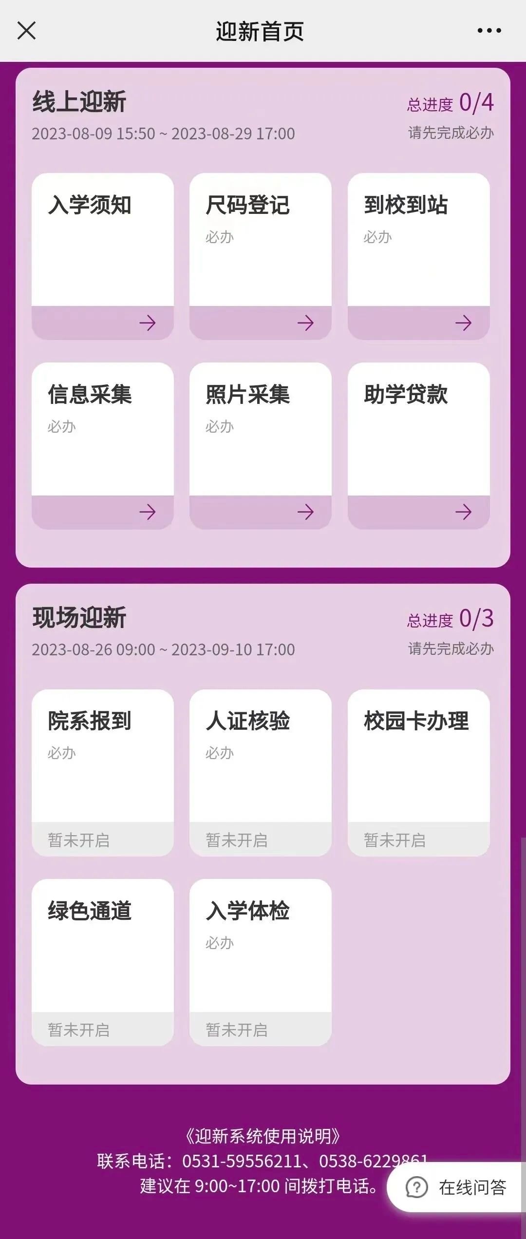 用户账号登录成功后,则打开系统首页。该首页包括四部分:迎新公告、线上迎新、现场迎新和在线问答。