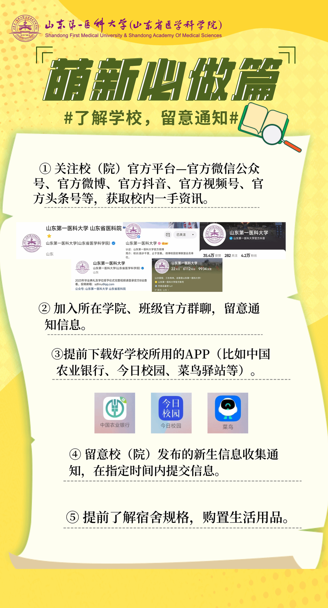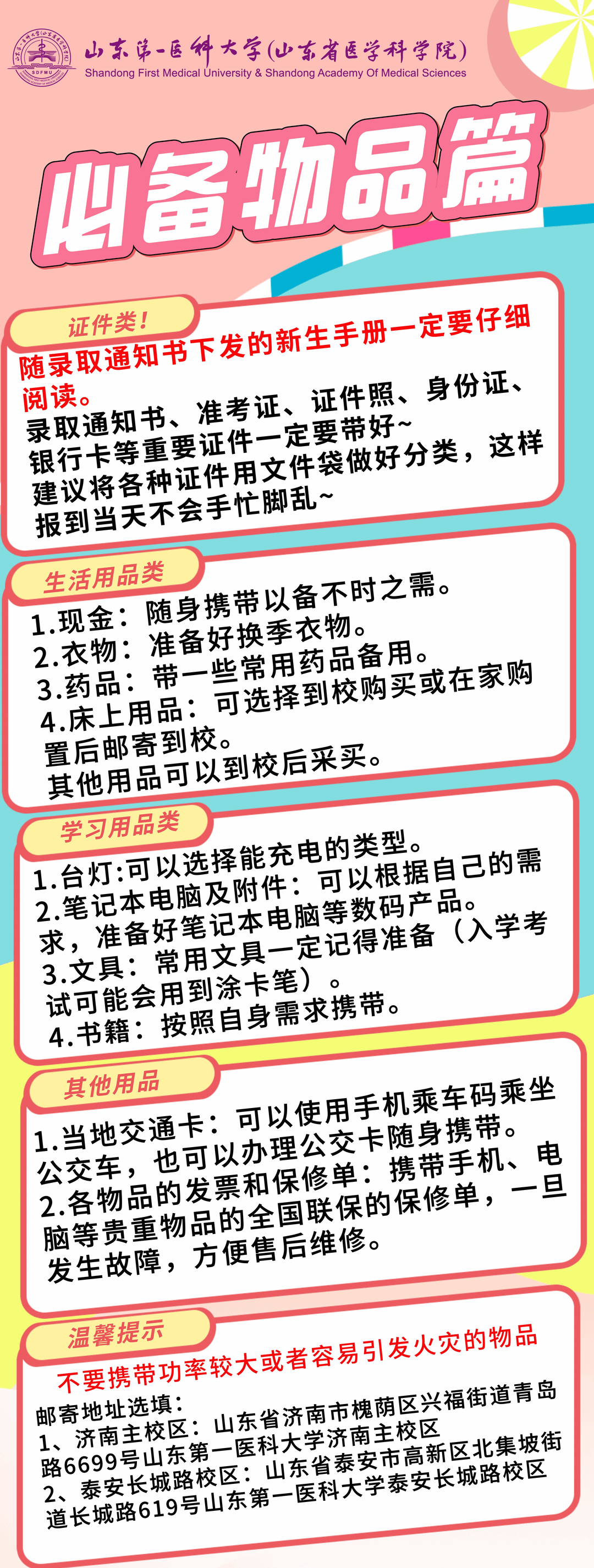 新生报到学院:眼科学院、预防医学科学学院(放射医学研究所)、药学院(药物研究所)、生物医学科学学院(省医药生物技术研究中心)、实验动物学院(省实验动物中心)、医疗保障学院(山东省医疗保障研究院)、临床与基础医学院(基础医学研究所)、口腔医学院、公共卫生与健康管理学院、研究生部。