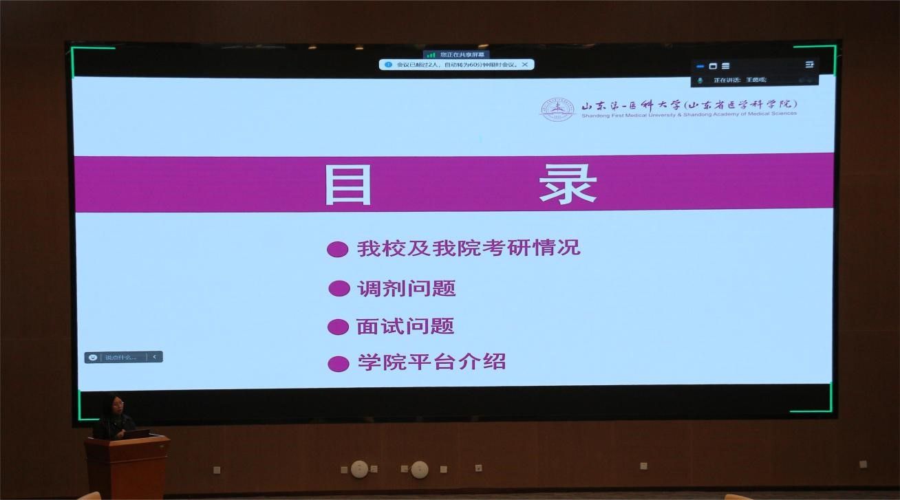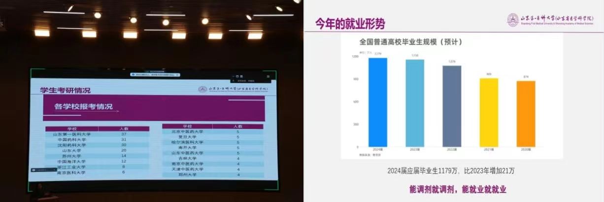 会议伊始,周延萌院长向与会同学们分享了我院2024年考研情况的初步统计数据,直观地展示了各专业、班级学生的考研意向,帮助同学们全面了解考研形势,清晰认知竞争压力,勉励大家要做好充分准备。周院长用翔实数据分析近几年高校毕业生就业形势,国内知名药企用人需求现状,建议同学们做好升学和就业两手准备。