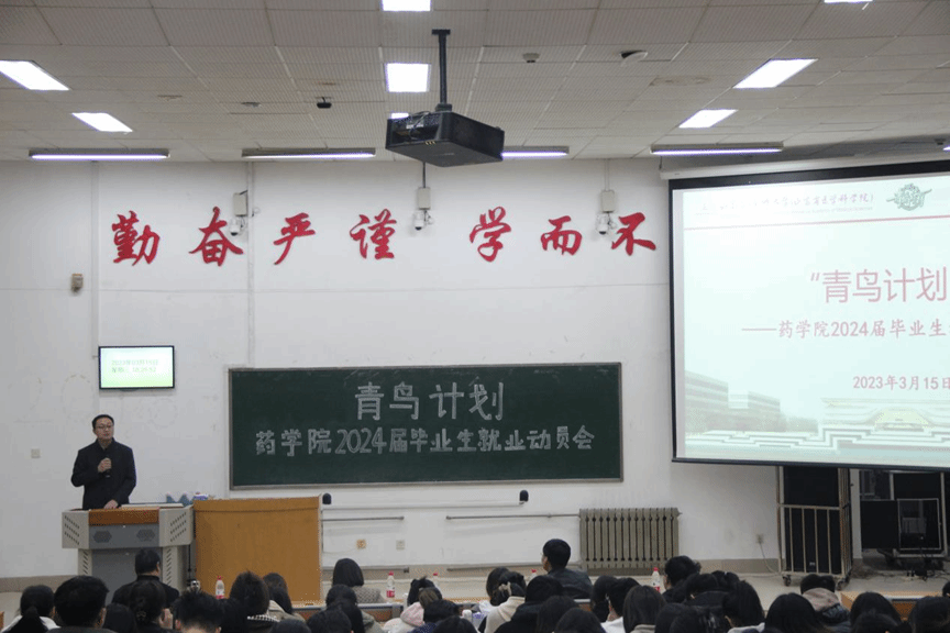 为加强学院党委班子对学生的思想教育和学业指导,发挥教工党员对学生班级的思想引领作用,促进2024届毕业生认清当前考研就业严峻形势,充分利用学校优质资源,做好考研准备和就业规划。3月15日晚,药学院在教学南楼C2017举办了“青鸟计划”药学院2024届毕业生就业动员会”。药学院常务副院长汪海洋、副院长段桂运、周延萌分别为同学们作报告,学生党支部书记、辅导员和2024届毕业生300余人参加会议。动员会由学院党委副书记宋洪涛主持。