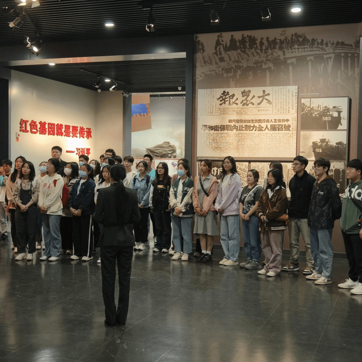 随后大家进入展厅内部,展厅分为两层,共“和战博弈齐鲁硝烟”、“运筹帷幄剑指济南”、“厉兵秣马蓄势待发”、“八天八夜鏖战古城”、“战略决战凯歌行进”、“接管济南泉城新生”“烈士忠魂日月同辉”、“新时代新泉城”八个部分。大量的抗战画作、英雄浮雕及珍贵的革命文物、历史影像陈列其间,向大家展现着那段不平凡的峥嵘岁月,诉说着先辈们艰苦卓绝、浴血奋战的英雄事迹,彰显了革命烈士永不服输、顽强拼搏的崇高精神理念。大家沉醉于绘声绘色的讲解,仿佛超越时空走进了血与火的战场,身临其境地感受到了震撼人心的抗战场景。