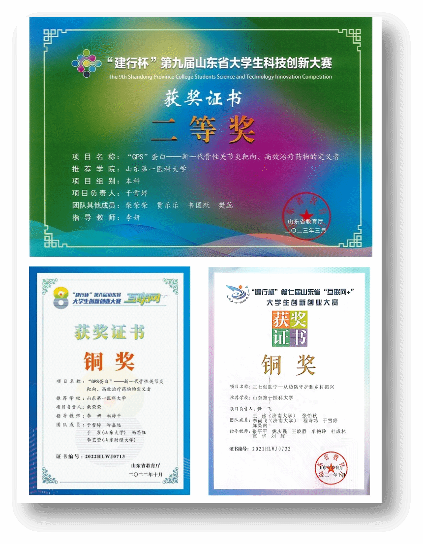 我善于将所学知识转化为应用能力和创造能力。借助校(院)科教融合优势,在课余时间,我走进实验室学习,重点研究靶向蛋白治疗方向的课题,开启了科研小白的蜕变之路。我始终保持多问、多看、多做的初心,一路良师益友的帮助,我已能够独立完成细胞毒实验、PCR、western等操作。我作为主持人负责本科生研究计划(SRTP)暨大学生创新创业训练计划立项一项,以第二作者在中科院一区《BBA-Molecular Basis of Disease》发表文章(IF:6.6)。2022年,我同团队成员积极参加互联网+、科技创新、挑战杯等学科竞赛,在不断挑战中锻炼创新能力和专业技能。所负责项目从院赛到校赛再到校赛决赛,一路过关斩将进入省赛,并获建行杯”第八届“互联网+”创新创业大赛省铜奖、山东省第九届科技创新大赛省赛二等奖等奖项。最慢的步伐不是跬步,而是徘徊;最快的脚步不是冲刺,而是坚持。取得过成功,也尝过失败,但正是这些经历让我更加坚定做一名科研人。