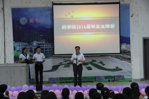 6月27日晚,药学院于物理楼报告厅成功举办了2014届毕业生晚会。药学院院长王德才、党总支书记龙跃洲、副书记张鸣凤、教研室及学团老师与二百余名毕业生共同观看了晚会。