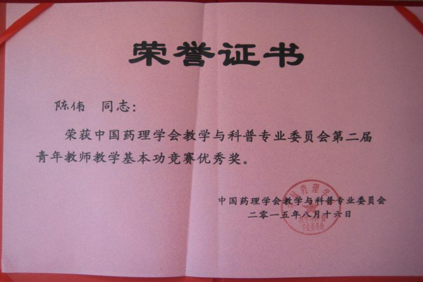 本次会议由中国药理学会教学与科普专业委员会主办。中国药理学会理事长杜冠华教授等多位著名药理学专家出席,并就药理学课程建设及教学改革作了学术报告。我校药学院药理学教研室王浩、陈伟两位老师参加了药理学教学基本功竞赛,并分获三等奖及优秀奖。