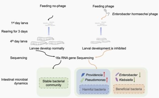 各种肠道共生菌对宿主肠道群落结构的影响是不同的,因此,了解一种特定的细菌共生体对肠道微生物群落结构和昆虫健康的贡献具有重要意义。针对某些细菌的噬菌体是可用于分析肠道细菌共生体的有效工具。然而,关于噬菌体在调节昆虫肠道细菌方面的功效的实验证据的报道很少。本团队建立了噬菌体定向去除家蝇幼虫肠道细菌的技术体系来调节细菌群落,并分析了噬菌体作用后对宿主健康的影响。噬菌体能够靶向家蝇幼虫的肠道特异性细菌,降低目标细菌的水平,使其成为研究肠道细菌功能的有效工具。