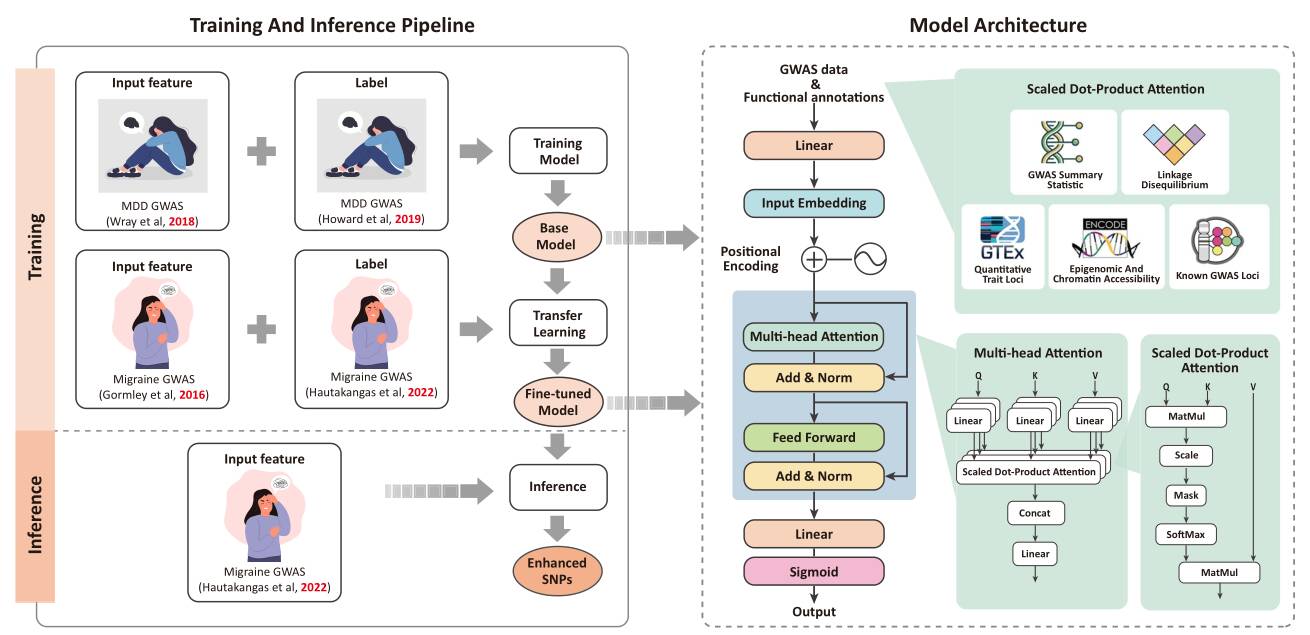 医学信息与人工智能学院常啸团队(科研助理孟子昂和青年教师宋颖超)开发人工智能算法在偏头痛遗传机制领域取得进展。相关成果以“Transformer人工智能模型赋能偏头痛全基因组易感基因发现(Transformer-based deep learning enhances discovery in migraine GWAS)”为题,于2025年12月10日在线发表于《自然‑通讯》(Nature Communications)杂志,论文链接:https://www.nature.com/articles/s41467-025-65991-7。
