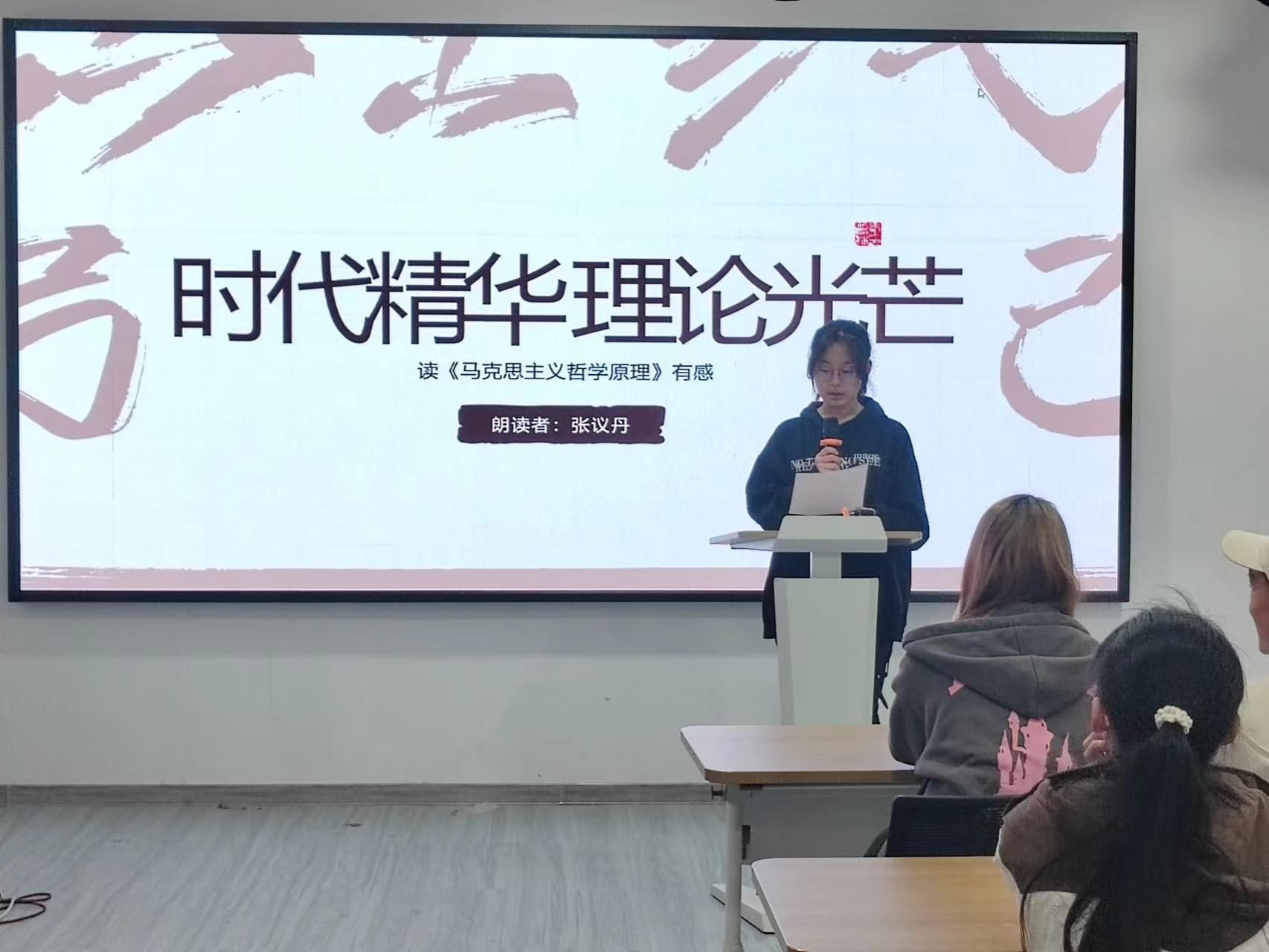 张议丹同学的《时代精华,理论光芒》诵读,突出了在中国特色社会主义新时代背景下,马克思主义作为推动中华民族不断前进的重要动力。