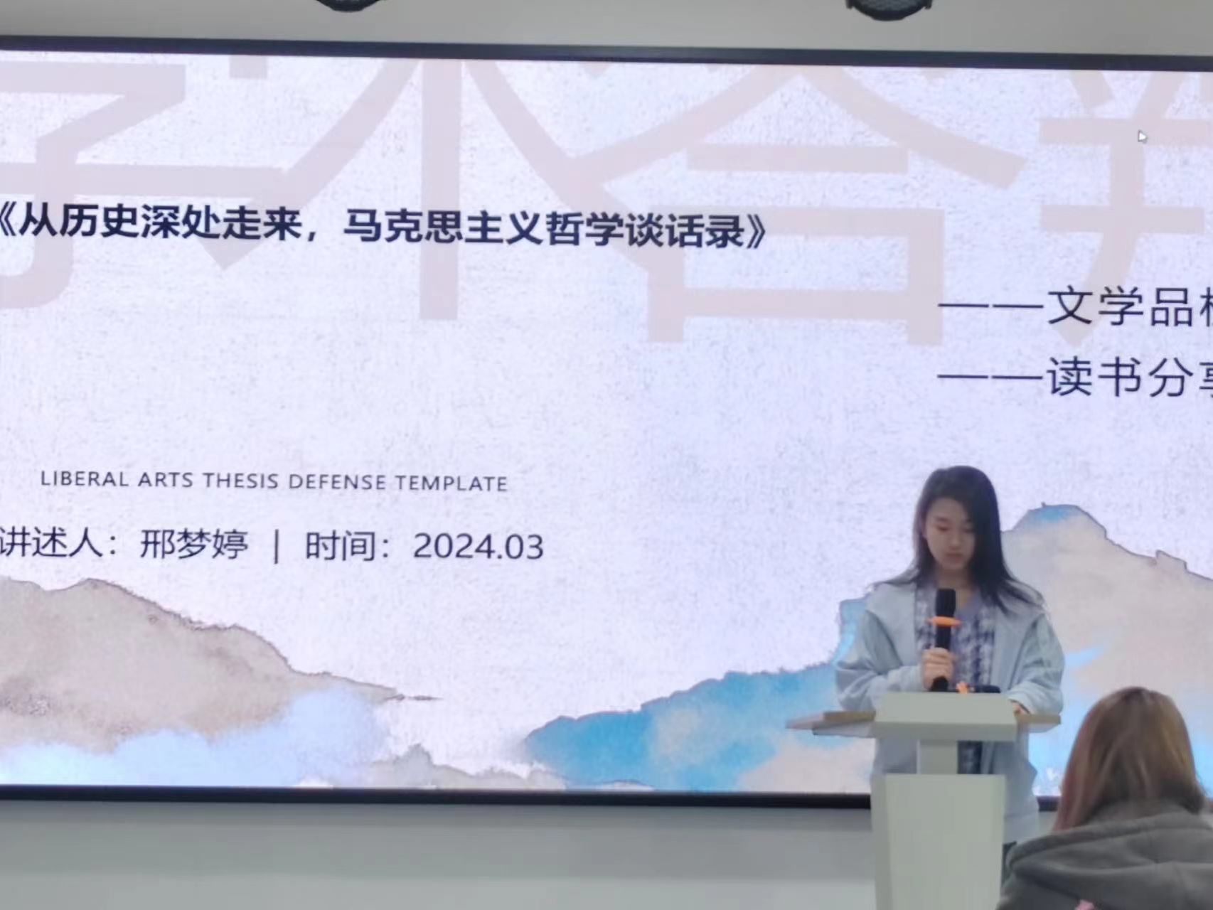邢梦婷同学通过《从历史深处走来,马克思主义哲学谈话录》的分享,引发了关于如何在新时代背景下更好地将马克思主义哲学与中国特色社会主义相结合的深入思考。