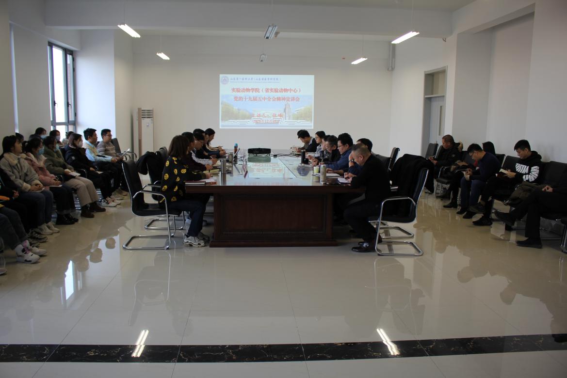 为深入学习贯彻党的十九届五中全会精神,推动五中全会精神入脑入心,根据校(院)《关于做好学习贯彻党的十九届五中全会精神宣讲工作的通知》要求,12月8日下午,实验动物学院(省实验动物中心)举行了党的十九届五中全会精神宣讲会,校(院)宣讲团成员、宣传部常务副部长张峰亲临学院(中心)进行了宣讲,学院(中心)党委书记谭桂明主持了宣讲会,全体教职工及部分学生代表参加了会议。