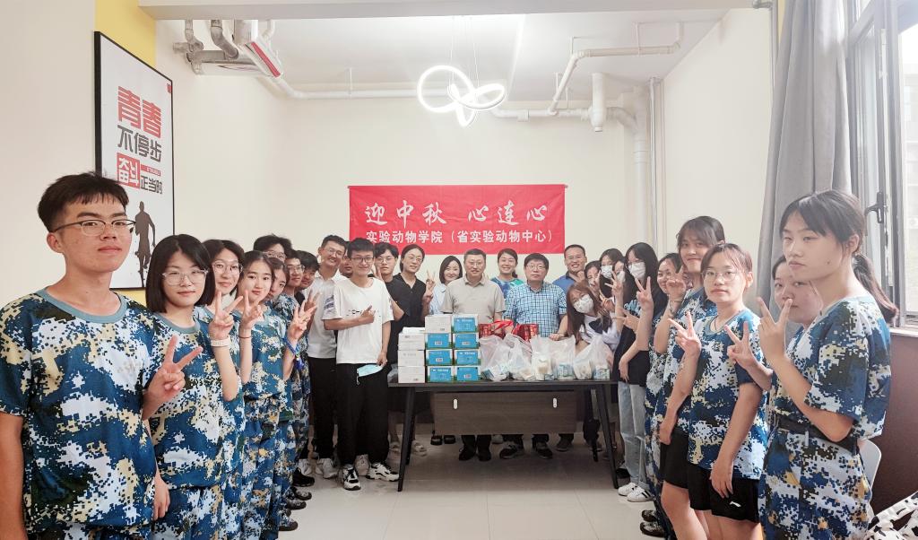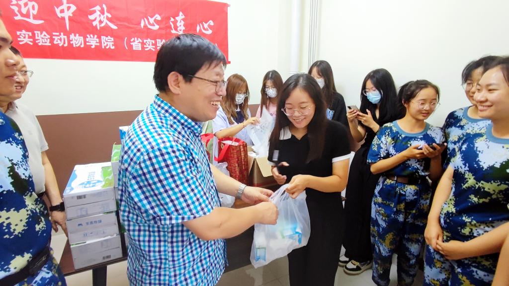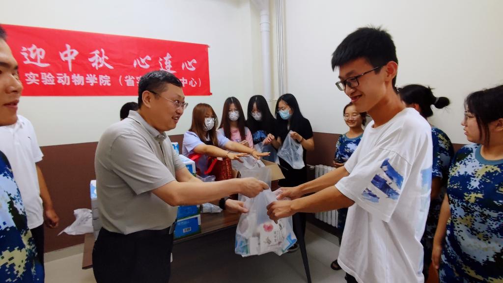 丹桂飘香迎暖意,秋韵沁菊心连心。为充分发挥党建引领作用,弘扬中华优秀传统文化,让假期未能归家团圆的学子们感受学院大家庭的温暖,9月9日,实验动物中心党支部走进班级、深入宿舍开展“迎中秋 心连心”学生送暖活动。中心支部全体党员干部前往学生公寓,为学生送上月饼、慰问品和节日祝福。