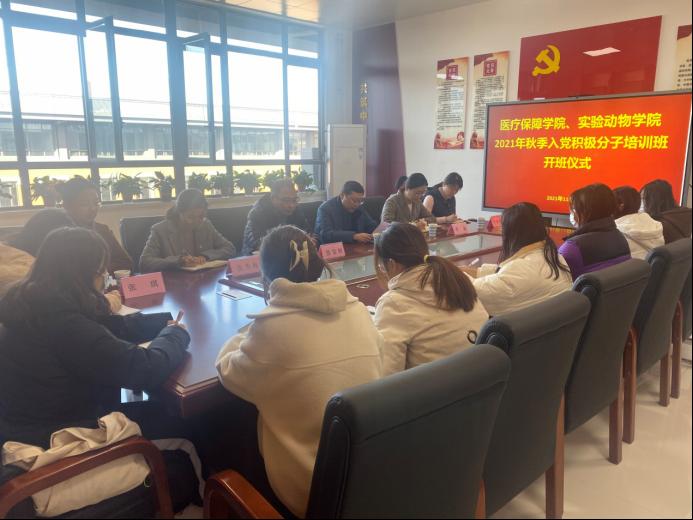 为加强学生入党积极分子的党性意识,深化对党的基本理论、基本路线和基本纲领的认识,贯彻落实《中国共产党发展党员工作细则》,11月11日下午,医疗保障学院与实验动物学院在医疗保障学院党建活动室联合举办2021年秋季入党积极分子培训班开班仪式。仪式由医疗保障学院党委书记苏宝利主持,两学院全体入党积极分子参加。