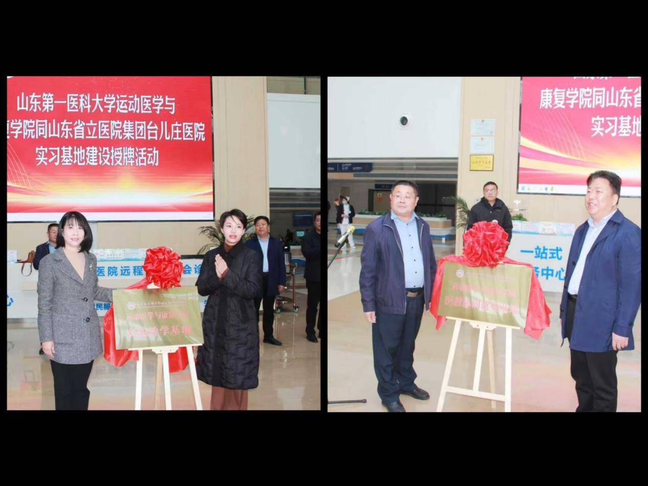 学院党委书记孙建翠在讲话中指出,此次双方合作既是响应健康山东建设战略、深化医教协同发展的生动举措,更是双方优势互补、携手共赢的战略选择。搭建优质实习就业基地,是打通“院校培养”与“临床实践”最后一公里的重要举措,对共同为区域群众提供更优质的康复医疗服务具有重要意义。未来,学院将以此次活动为新起点,与山东省立医院集团台儿庄医院在党建共建、人才培养、临床实践、科研创新等方面深度携手,并肩前行,为健康山东建设及区域医疗卫生事业高质量发展贡献坚实力量。活动现场,与会领导共同为“实践教学基地”和“医教协同就业基地”揭牌,双方正式签订实习协议。