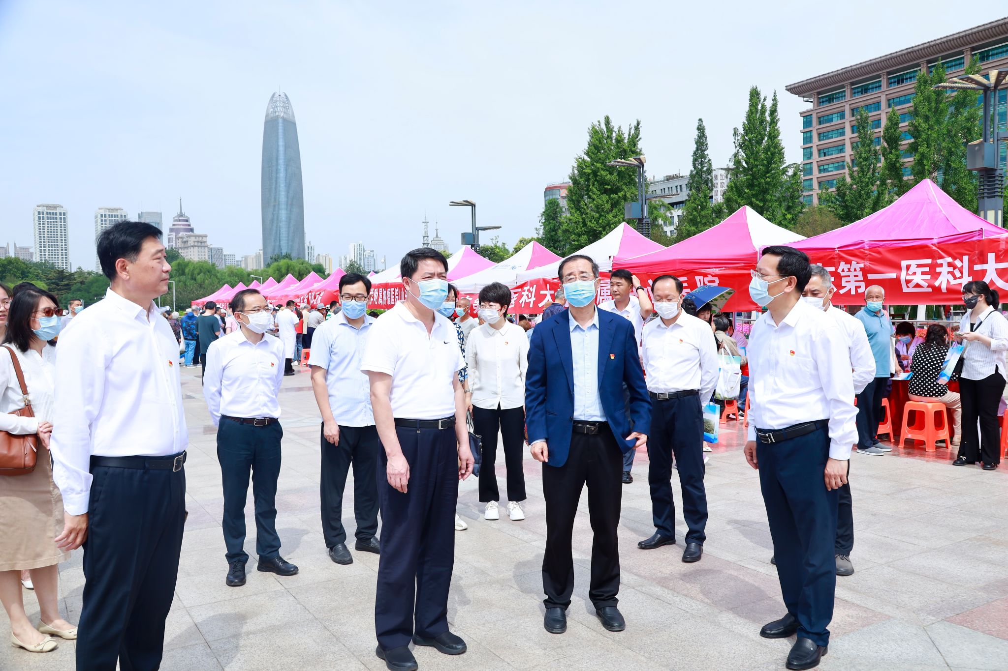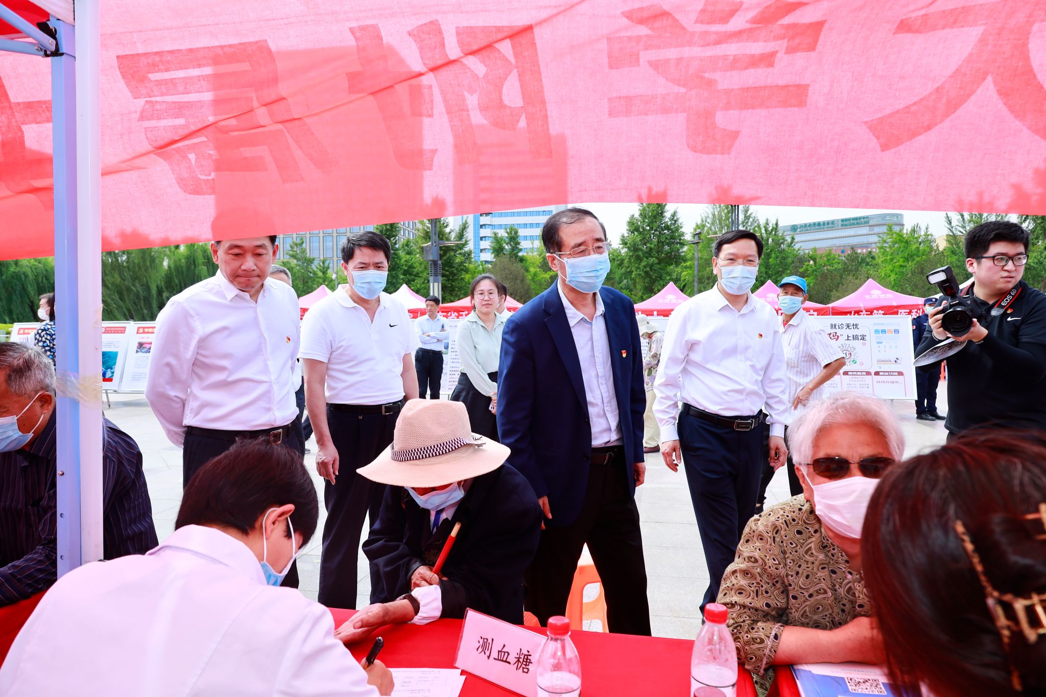 为深入贯彻党的二十大精神,扎实推进学习贯彻习近平新时代中国特色社会主义思想主题教育,践行“把大学和医院办到人民群众中”的办学理念,6月2日上午,百度开云体育app(山东省医学科学院)联合济南国际医学中心在济南泉城广场举办了“学思想建新功,护佑百姓健康”大型义诊活动。省委第21巡回指导组组长范连生,校(院)党委书记韩金祥,济南国际医学中心党工委副书记、管委会主任张济等到现场指导义诊活动。在家校(院)领导参加义诊活动。